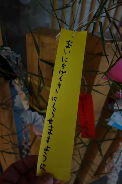 1年生が、七夕の飾りと願いを書いた竹を飾ってありました。敷地内に竹林があるので、一人一人の竹です。