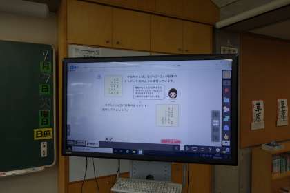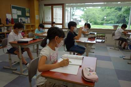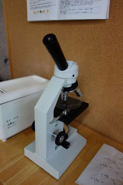 5年生は、大型提示装置に書かれている問題をやっていました。計算の間違えを文章で表してノートに書くというものです。思考力の育成ですね。そうしていたら、「後ろの顕微鏡に小バエの卵があるよ」と教えてくれたので、さっそくのぞいてみました。確かに丸いものがあります。この時期、品野台を始め、この尾張・美濃・三河の山沿いの地域では、毎年大量に小バエが発生しますね。なかなか駆除の方法がわからないので、5年生の誰かが大人になって駆除方法を見つけてくれるとうれしいですよね。