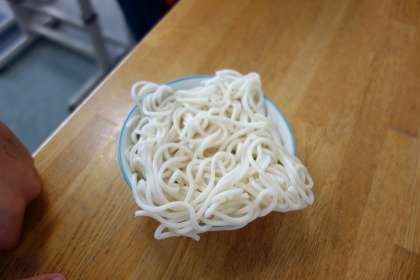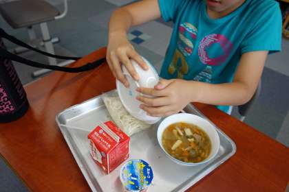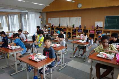 4年生の教室の給食の様子です。ソフト麺ですね。昔はソフト麺どうしがくっついて、お汁に入れるときに苦労していましたが、最近のソフト麺はつるっとして麺もほぐしやすくなっています。4年生の児童は、お皿で4等分にして入れていました。賢いですね。と思えば、まるまる全部入れてしまい、この状態でおわかりに来て担任から「お汁が入れれないよ」と言われていました。確かに上からお汁を入れるとこぼれますな。