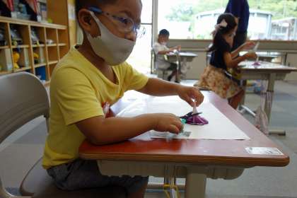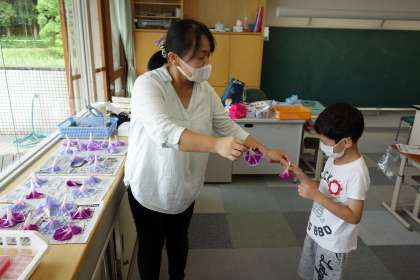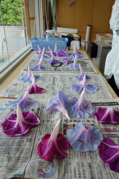 朝、咲いたアサガオで学習です。担任から1つずつもらって、なんとハサミできっちゃいます。