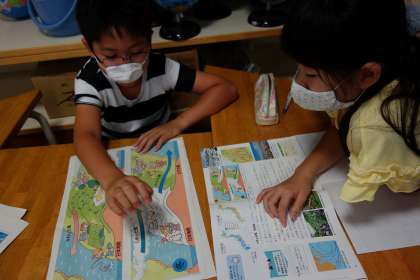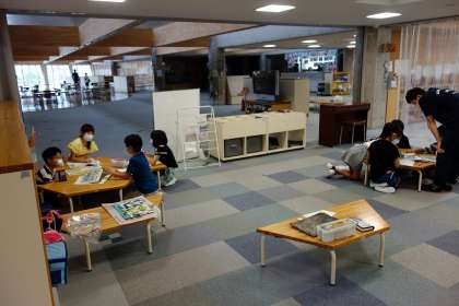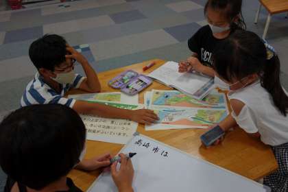 グループ学習です。あまり近々ないように、静かに会話をしています。いつもいつも単独の席での学習では学びが画一化されてしまいます。