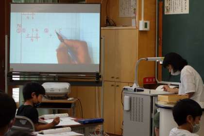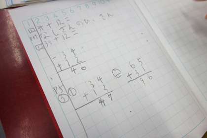 筆算ですね。ノートのマス目にどのように筆算の式を書くのかを大型提示装置で担任が示しています。小学校の低学年のうちは、こういう土台になる部分を習得します。