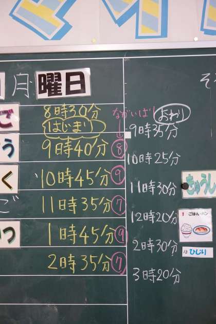 背面黒板には授業時間ごとの時刻が書いてあります。品野台はチャイムが鳴りません。すべて時計を見て動くのです。