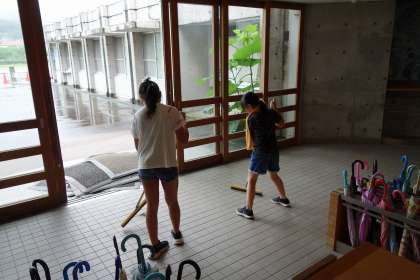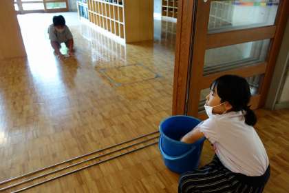 今日は玄関掃除の紹介です。雨なので湿気があり大変です。低学年もぞうきんの絞り方を習って自分でやります。できない児童は高学年に絞ってもらいます。
