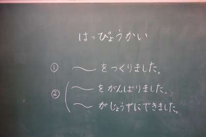 図工で作成した作品の発表会です。発表する児童の回りに集まり、作った物、工夫したところなどをみんなに発表します。時には先生ががんばったいたことを説明します。そしてみんなはその発表を聞いたり、作品を見たりした感想を言います。