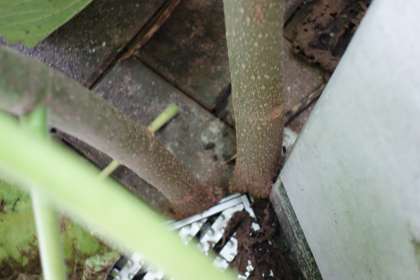 折れる原因は根元を見るとわかります。この木の生えているのはコンクリートの隙間です。これ以上太くなることができないのです。でも根っこが生きていて毎年生えてくるのだそうです。