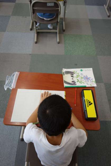 2つめは、担任が「ノートに書く場所を体の中心にしていますか」という指示があったので、はっとして児童の真後ろに立ったら、ちゃんと体の中心線上で文字を書いていました。とてもとても大切なことですね。