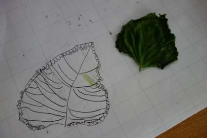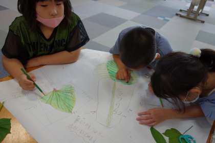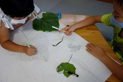 葉の葉脈を観察していました。自然がたくさんあるので、いろんな葉があります。図工で葉を描くと緑色一色にしてしまうことがおおいのですが、こうやってじっくりと観察して色分けする目力も身につけてほしいですね。