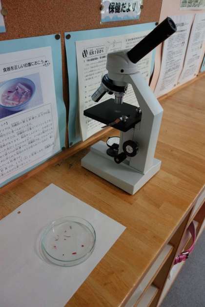 今日も後ろのロッカーの上に顕微鏡がありました。教頭は、理科の実験で顕微鏡を使うと、いつもこのように誰でもいつでものぞけるように、置いています。子どもたちに聞くと、ホウセンカの葉脈などの観察だそうです。カメラではさすがに顕微鏡のようには撮影できません。