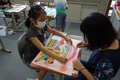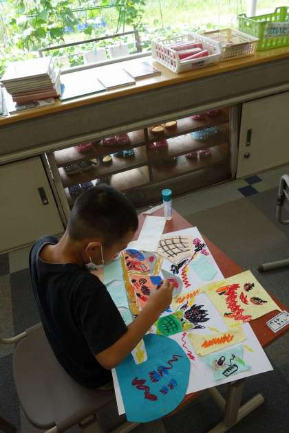クレヨンを使って、自分の創った世界を表現しています。想像の世界って、人それぞれなので見ていてとても楽しいです。