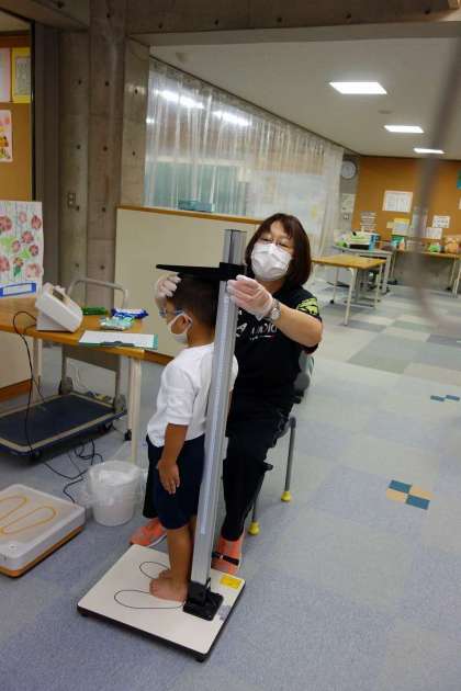 後半は体重測定です。みんな大きくなりたいのでピーンとまっすぐに立ちます。