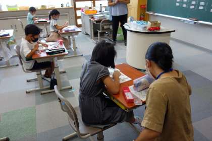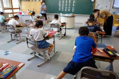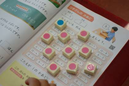 おやおやこれは何をしているのでしょうか。教科書にはたくさんの引き算があり、答えが2になるところにブロックを置いていくという学習でした。ちゃんとやれると綺麗な図形ができるので熱心に計算します。間違えると不自然の形になるので、間違えたところがわかるんですね。なるほどーと思いました。