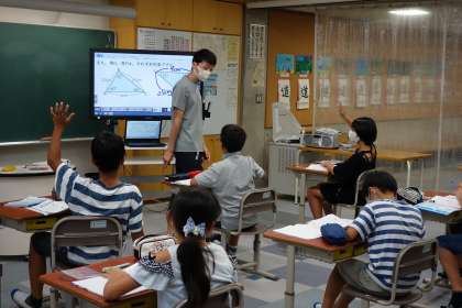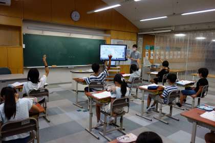 三角形の学習ですね。内角の和と相似のようです。電子黒板はタッチペンで書き込めるので、とても便利です。スマホでも液晶画面に直接触るのが当たり前ですから、今年度に導入されるタブレットでも子どもたちは当たり前のように画面に触り、使いこなしていくでしょう。