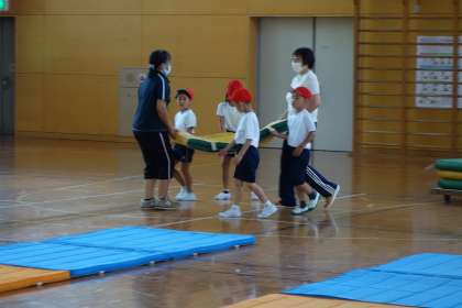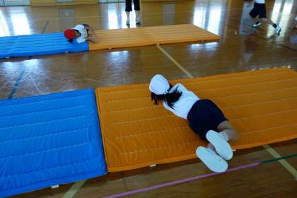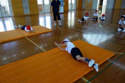 マットは一人では運べないので、みんなでよいしょと運びます。手足をピンと伸ばし、ごろごろとマットの端まで転がっていきます。「途中でマットから落ちたらダメだよ」と言われますが、なかなか曲がらず、まっすぐに端まで行くことは難しいようです。