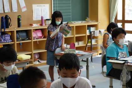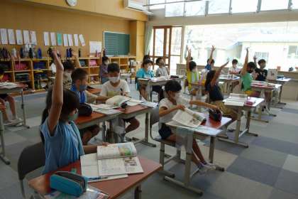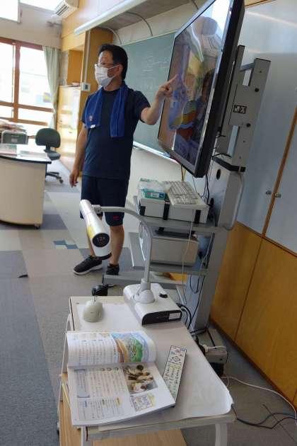 4年生は「水のゆくえ」ということで、蒸発→雲→雨という大気の循環の学習です。書画カメラを使い、絵を見せながら考えさせています。