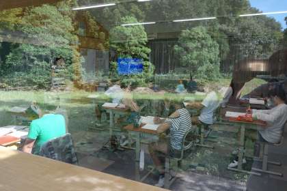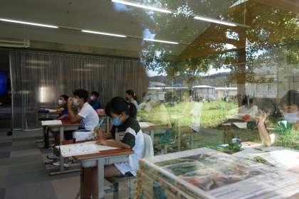 お隣の6年生の教室を覗きました。ガラスがあるので反射して、中の様子、外の様子が写っています。一生懸命、学習している6年生、ガラスでみんなで歩いている1年生がわかると思います。