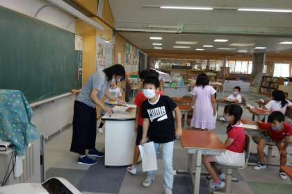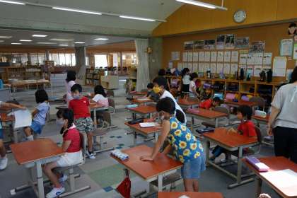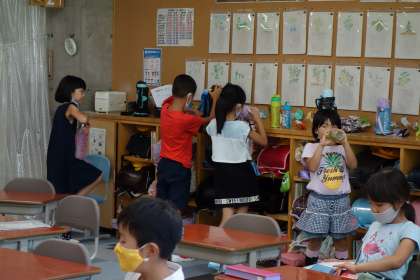 6年生に引き続き、2年生の教室をベランダから撮影です。担任に提出すると放課です。ほとんどの子が水筒からお茶を飲んでいました。