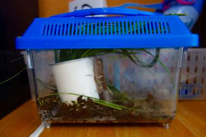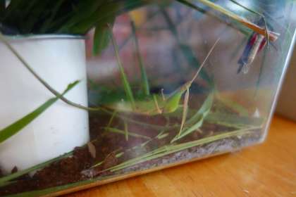 先週にこのホームページでもお知らせしたバッタたちが後ろのロッカーの上にいました。えさもちゃんと新鮮にあるので、元気です。巨大なショウリョウバッタもいます。この時期は地面にはバッタ、空中にはトンボがわんさかいます。それと・・・その虫たちを狙うクモがいたるところにクモの糸で網をつくっています。みんな冬に向けて精一杯生きています。