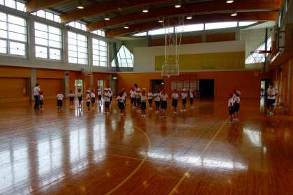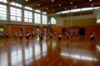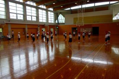 1・2年生は合同体育です。体操隊形に開く練習です。空間認知、距離認知がまだまだ発達していません。どうしても自分たちだけでは並べません。教員が一列ずつ直します。運動会では、こういう体験が生きます。ですから今年のスポーツ大会で、体操隊形への移動がうまくできていたら、褒めてあげてください。