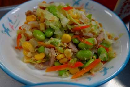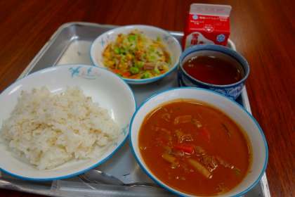 本日の給食はシチューと野菜サラダです。学校ではルーからすべて作るので、他では味わうことができない味です。野菜サラダには枝豆も入っています。私は枝豆が大好きなので、こういう組み合わせには目が輝きます。