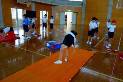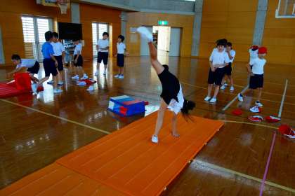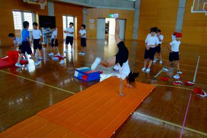 側転の後半の動きを連続撮影しました。どうですか?足を開く可動範囲がとても広いことがわかると思います。今後タブレットが入ると、自分のタブレットで撮影し、見ることができるようになります。早く入って欲しいものです。