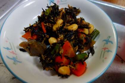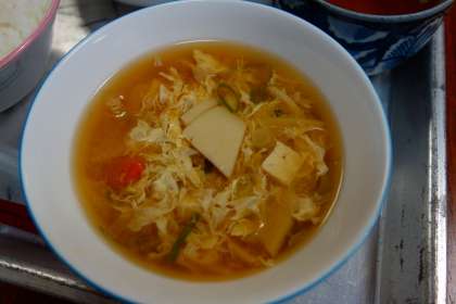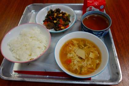 卵とじ汁とひじき煮です。最近気づいたことがあり、卵とじ汁に入っているかまぼこの存在と油揚げの存在が重要だということです。かまぼこがないと噛むということをしなくてものどから胃へ入っていきます。かまぼこを噛むことで味覚をしっかり感じるんですね。そのとき、じわっと油揚げの油がコクとなって伝わってきます。ですから深みのある味になるんです。このぐらい書けるのなら食レポができるかなと一瞬思いました。