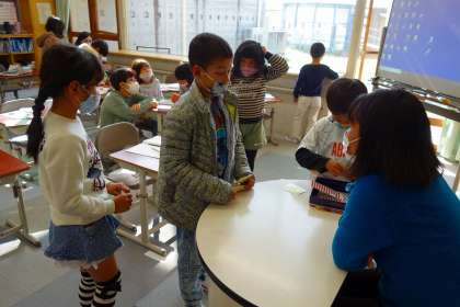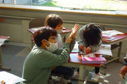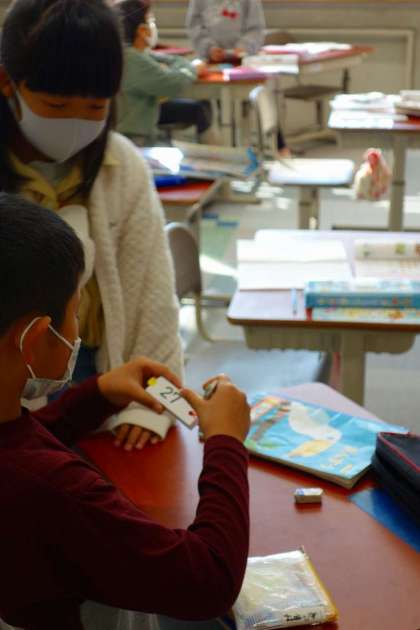 今日は「三の段」ですね。一人で暗唱する子、友だちに聞いてもらう子などいろいろです。そして最後は担任チェックです。「くく、はちじゅういち」まで頑張りましょう。