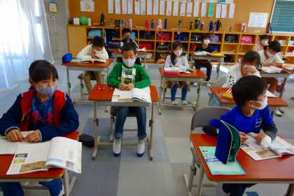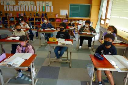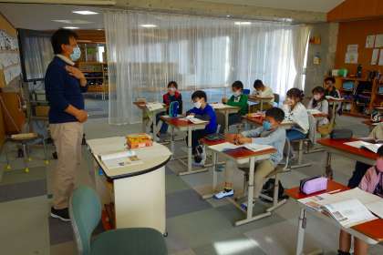 違う時間に再び4年生を訪れると、宝暦治水の授業でした。4年生は木曽三川公園に社会見学に行くので、それに向けての学習です。