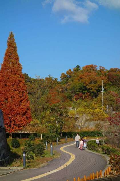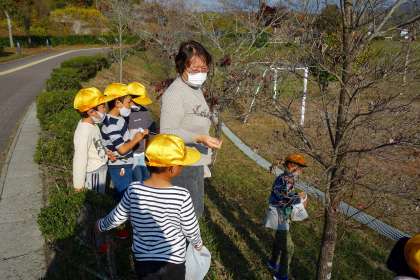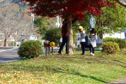 1年生がいろいろな木の下で集まっては次の木へ下へと動いていたので、見に行くと、いろいろな色の葉や実を集めていました。本校は紅葉になると豊かな色彩になります。これも校舎ができる時に考えられて植えられています。