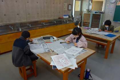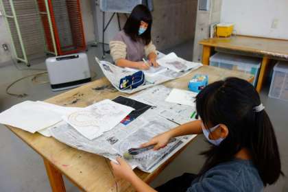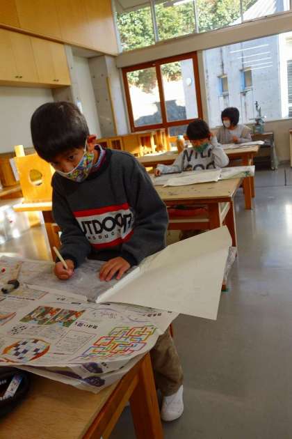 版画は白黒で表現しますので、大変難しいです。丁寧にやるところを雑にやるとすぐに目立ちます。子どもたちは心得たもので、丁寧に、丁寧に彫っていました。