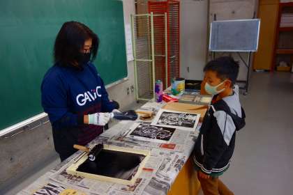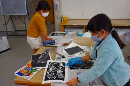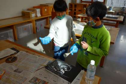 3年生はいよいよ刷りの段階に来ました。インクの量の加減がとても難しいです。そして刷りが甘いとムラがあります。何回も何回もトライします。手がインクで黒くなるのを防ぐため、ビニル手袋をしてますが、それでも汚れてしまいます。
