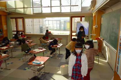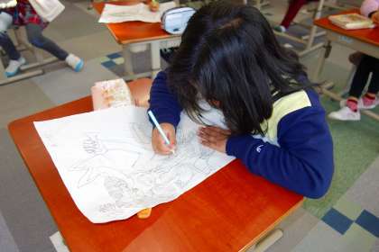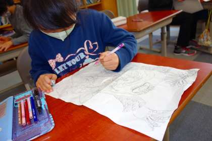 2年生は下絵の完成に向けて頑張っていました。構図の善し悪しが大きく作品に影響するため、担任をはじめ、みんな意欲的です。