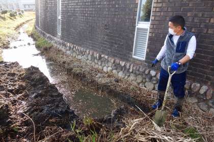 本校のせせらぎとビオトープは、山や蟹川からの導水を利用しています。ですから大雨の時などは土砂(もちろんゴミも)が溜まっていきます。
