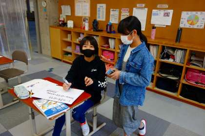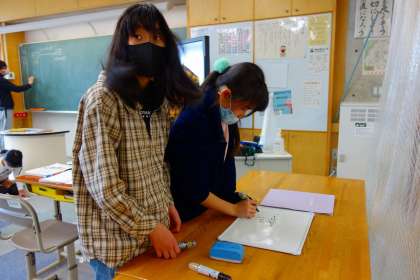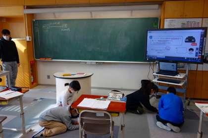 文章題をペアで考えています。その考えをもとに式をホワイトボードに書いていますね。いつもはじっくりと取り組むのですが、こういう活動も時間的に短くしています。