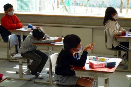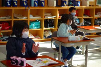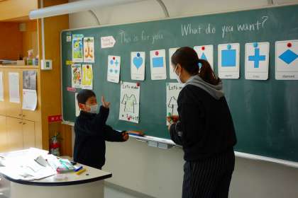 なにやらとても盛り上がっていました。黒板に貼ってあるいろいろな単語、たとえばサークル(丸)、トライアングル(三角)、スター(☆)という英単語を言って、紙に描かれているTシャツに模様をつけていくという、なんとも説明が難しい授業でした。