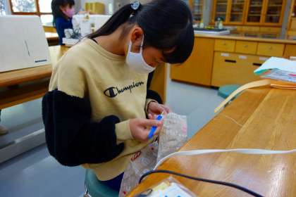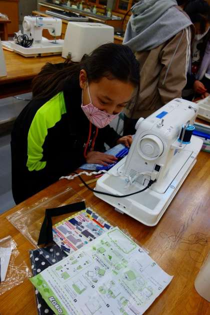 ミシンを使っていました。ミシンは難しそうで実は簡単です・・・とは思っていません。慣れないと扱いにくいものです。私が見ている10分間でも、ミシンを操作しているより、作り方の用紙とにらめっこしたり、布から糸を外していたりとトラブル中の児童が多く見られました。何事も経験です!