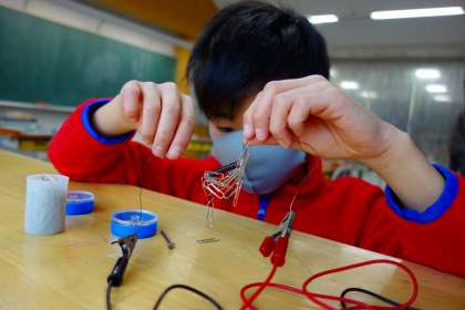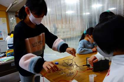 電磁石ですね。面白いのでみんな真剣です。「電気を切っても引っ付いているのはなんでだろうね?」とか「クリップの下にまたクリップがつくのは何でだろう?」と声をかけながら撮影すると、いろいろな考えが聞かれました。