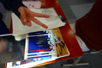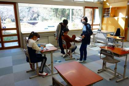 教室で「鬼滅の刃」のイラストを描いている子がいました。それを見て楽しそうにしている子もいます。なかなか上手にかけていますね。