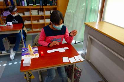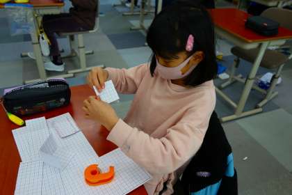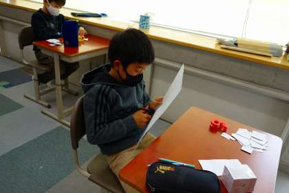大きな厚紙から立方体の面を切り、セロテープで貼り付ける作業をしています。こういう作業が得意な子、苦手な子がいますが、とにかく楽しそうです。