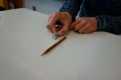 鉛筆の上にちょこんと載せたシャーペンの芯があります。そこに磁石を近づけていくと、くっつく寸前にシャーペンの芯は反発して逃げて行きます。