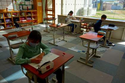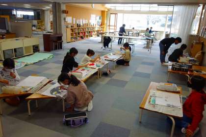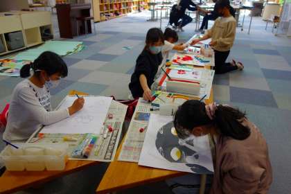 5年生は物語から浮かんだ情景を絵にしています。ワークスペースは絵の具を使う場所として、教室は下絵を考える場所として分けていますね。カーペットに絵の具や水をこぼさないようにお行儀良く取り組んでいます。