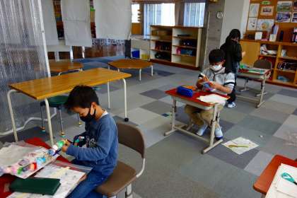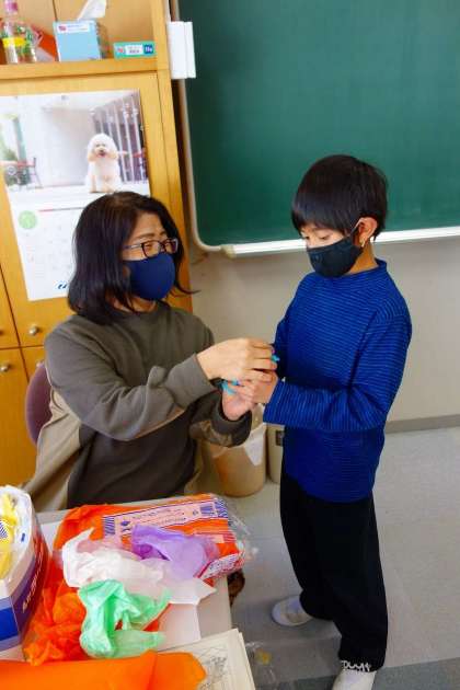 途中で担任に聞いたり、友だちと相談したりと自由に発想を広げています。自分の服のボタンに髪の毛がからんでしまい、友だちに助けてもらっているアクシデントもありましたが、無事に解決しました。