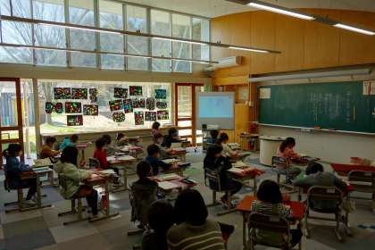図工の作品もできあがって窓に飾られていますね。透き通った部分の色セロファンがとても綺麗です。