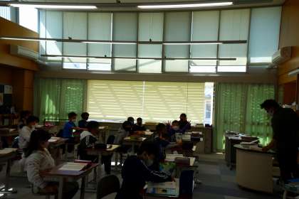 日差しが強いので、ブラインドを閉めて授業をしています。カメラを向けると必ずこちらを意識してカメラ目線になります(笑)