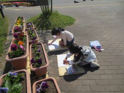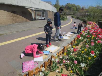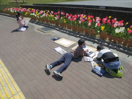 ぽかぽか暖かいので、玄関前で写生です。ある子が「先生見てみて。チューリップの花粉がいっぱいだよー」というと、何人かの子が集まってきます。そうすると「先生、花粉ってなあに?」と質問が出るので、2年生にわかるような単語を使って説明しようとするのですが、それがなかなか難しいのですわ。