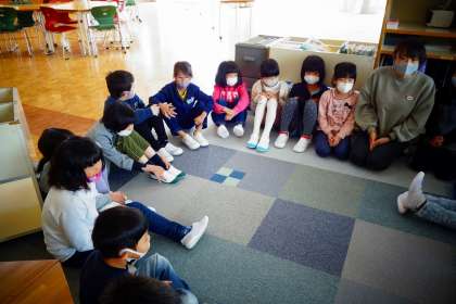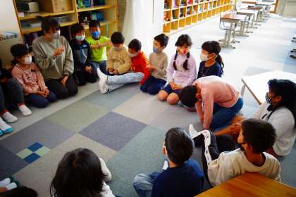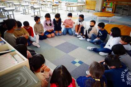 輪になっているので、てっきりハンカチ落としでもやっているのかと思えば、みんなでお話をしています。学級のメンバーは同じでも、担任や教室が違うと気持ちがリセットされて、こういう親近感が湧く話し合いはとてもいいですね。