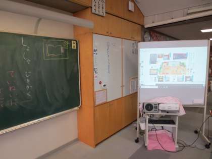 書写の時間でした。教室の中にある「お」を探していました。この時は「にゅうがくおめでとう」と掲示してあるのでたくさん見つけられます。