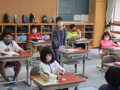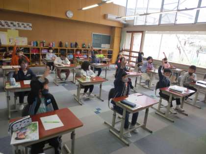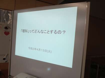 「初めての理科」です! 1・2年生は生活科でしたので、理科は初めてです。理科って何をやるんだろうと関心があるので、食い入るように話を聞いています。いい感じです。