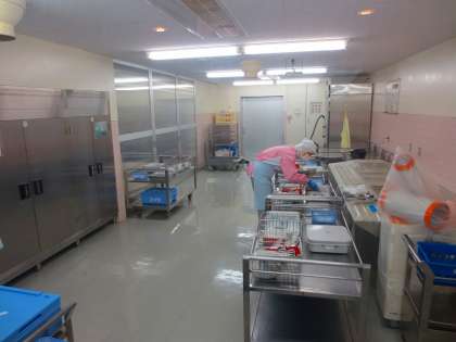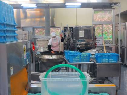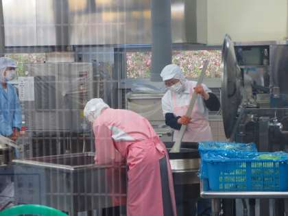今年度、栄養職員が交代しました。また3名の調理員のうち、1名が交代となりましたので、調理中の様子を窓の外から撮影させてもらいました。これから大鍋で調理が開始するところですね。