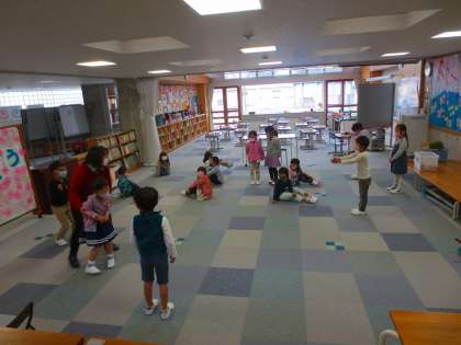 さて、記事はコミュニケーション能力あげる練習です。5人ずつ丸く坐り、一人がホールを持ちます。ボールを持った子は、自分の名前と好きな食べ物を言います。言い終わったら他の4人から一人を選んで、名前を呼びながらボールを転がして渡します。
